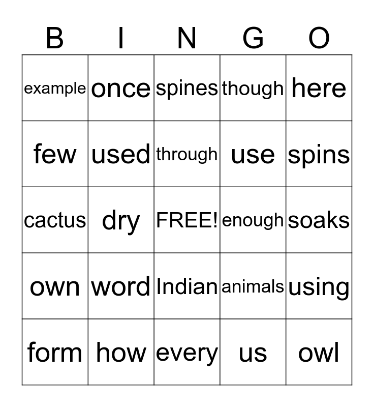 This bingo card has a free space and 24 words: word, how, through, form, here, example, few, once, enough, Indian, use, cactus, animals, using, used, us, soaks, spines, spins, dry, owl, own, though and every.
