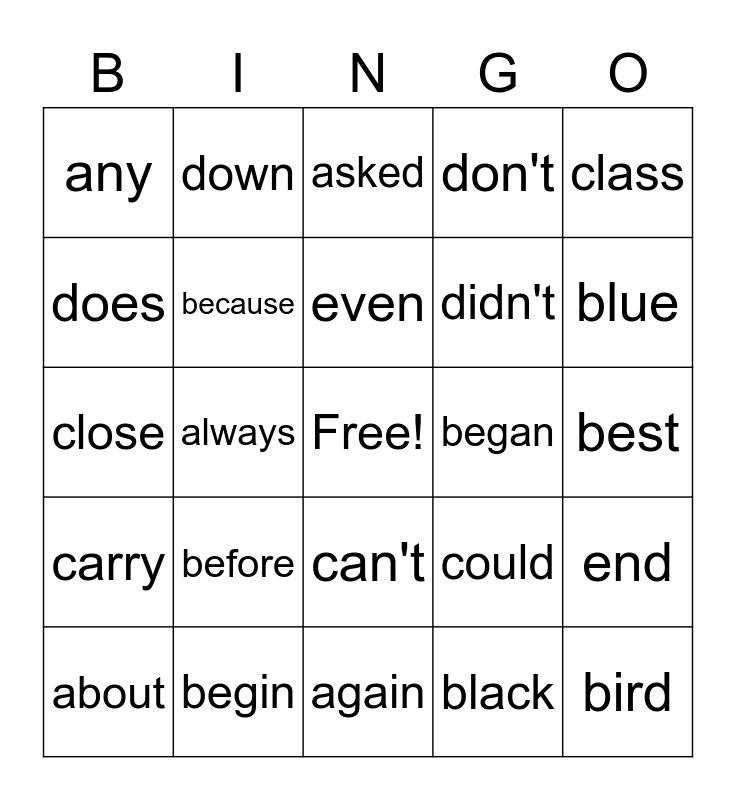 This bingo card has a free space and 29 words: about, along, always, animal, any, asked, because, before, began, begin, best, bird, again, black, blue, both, can't, carry, class, close, could, cried, didn't, does, don't, down, end, even and ever.