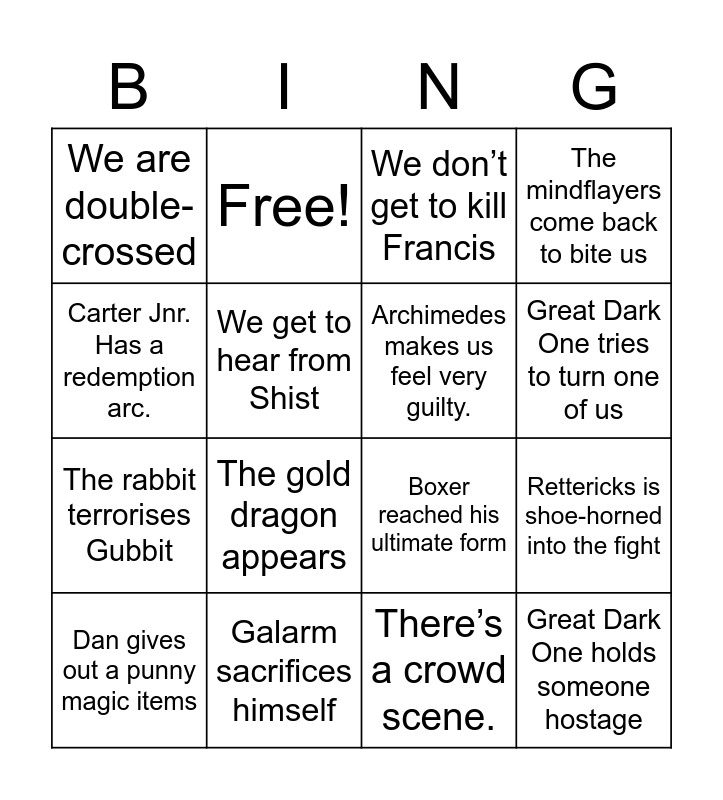 This bingo card has 16 words: Galarm sacrifices himself, Rettericks is shoe-horned into the fight, We don’t get to kill Francis, We are double-crossed, The rabbit terrorises Gubbit, Free!, Boxer reached his ultimate form, There’s a crowd scene., Carter Jnr. Has a redemption arc., We get to hear from Shist, Dan gives out a punny magic items, The mindflayers come back to bite us, The gold dragon appears, Great Dark One tries to turn one of us, Archimedes makes us feel very guilty. and Great Dark One holds someone hostage.