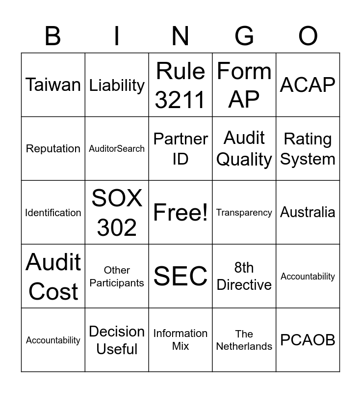 This bingo card has a free space and 27 words: 8th Directive, Disclosure, Audit Quality, Information Mix, Reputation, Rule 3211, Liability, Audit Cost, Transparency, Accountability, Identification, Form AP, Accountability, Decision Useful, Rating System, Misunderstanding, AuditorSearch, Partner ID, Other Participants, Taiwan, Australia, The Netherlands, SOX 302, PCAOB, SEC, ACAP and Comment Letter.