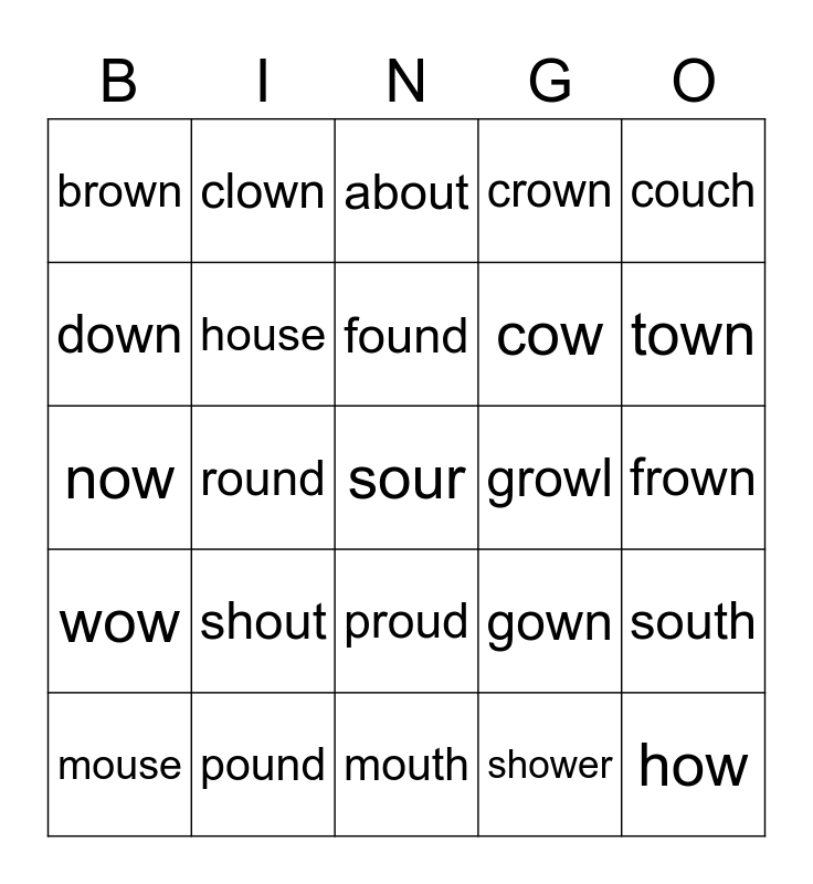 This bingo card has 25 words: shout, mouth, found, mouse, couch, brown, down, clown, growl, proud, cow, now, gown, south, house, how, frown, about, town, round, sour, pound, wow, crown and shower.