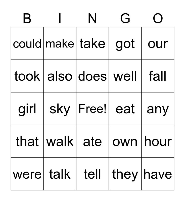 This bingo card has a free space and 24 words: walk, talk, does, were, our, could, took, make, eat, ate, well, girl, own, hour, also, they, any, take, fall, sky, have, that, got and tell.