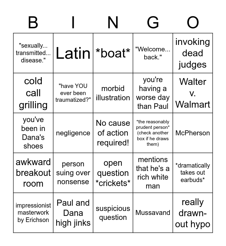 This bingo card has a free space and 24 words: person suing over nonsense, Paul and Dana high jinks, morbid illustration, impressionist masterwork by Erichson, invoking dead judges, "sexually... transmitted... disease.", cold call grilling, Latin, *the reasonably prudent person* (check another box if he draws them), open question *crickets*, you're having a worse day than Paul, you've been in Dana's shoes, mentions that he's a rich white man, *dramatically takes out earbuds*, "have YOU ever been traumatized?", Mussavand, McPherson, *boat*, Walter v. Walmart, negligence, really drawn-out hypo, awkward breakout room, "Welcome... back." and suspicious question.