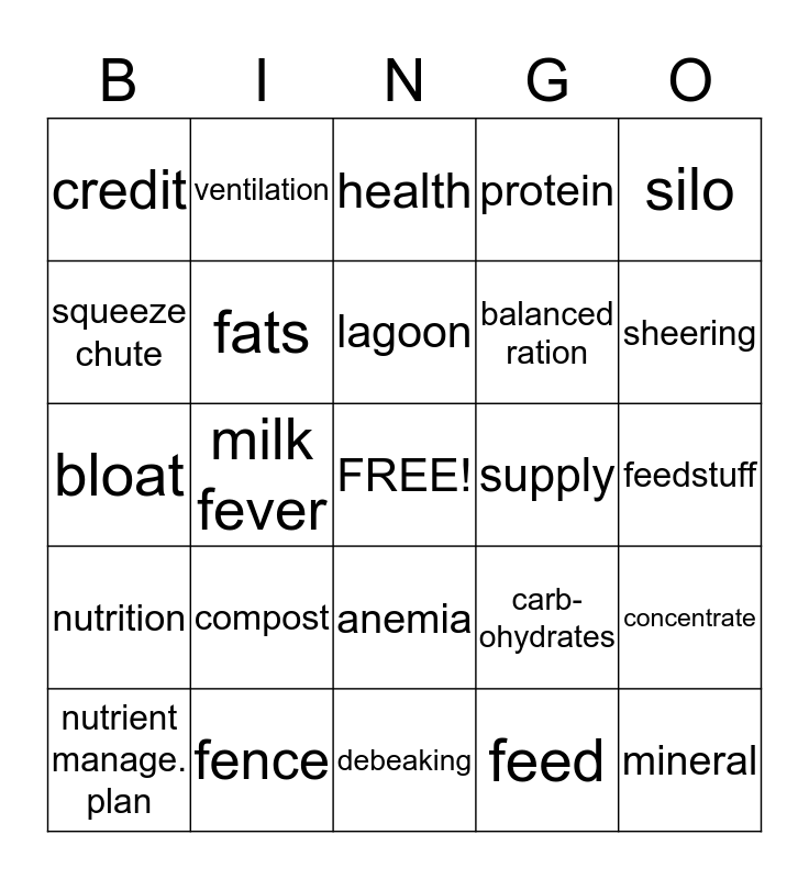This bingo card has a free space and 24 words: compost, fence, lagoon, nutrient manage. plan, silo, credit, squeeze chute, ventilation, supply, anemia, balanced ration, bloat, carb- ohydrates, concentrate, fats, feed, feedstuff, health, sheering, milk fever, mineral, nutrition, protein and debeaking.