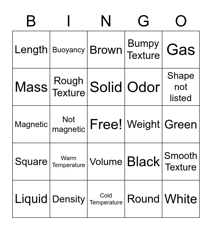 This bingo card has a free space and 24 words: Warm Temperature, Density, Solid, Liquid, Gas, Length, Mass, Buoyancy, Weight, Volume, Odor, Magnetic, Black, Smooth Texture, Rough Texture, Round, Green, Brown, Shape not listed, Not magnetic, White, Square, Bumpy Texture and Cold Temperature.