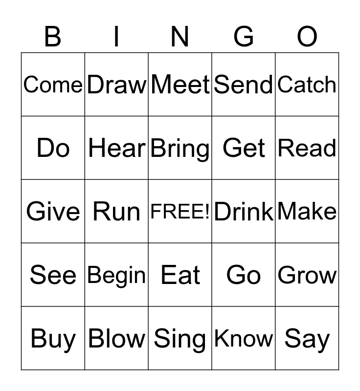 This bingo card has a free space and 24 words: Begin, Blow, Bring, Buy, Catch, Come, Do, Draw, Drink, Eat, Get, Give, Go, Grow, Hear, Know, Make, Meet, Read, Run, Say, See, Send and Sing.