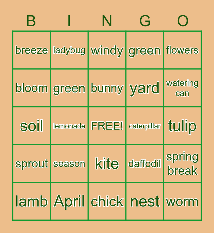 This bingo card has a free space and 24 words: season, April, bunny, lamb, flowers, breeze, bloom, ladybug, caterpillar, kite, yard, soil, daffodil, spring break, green, nest, tulip, windy, watering can, lemonade, worm, sprout, green and chick.