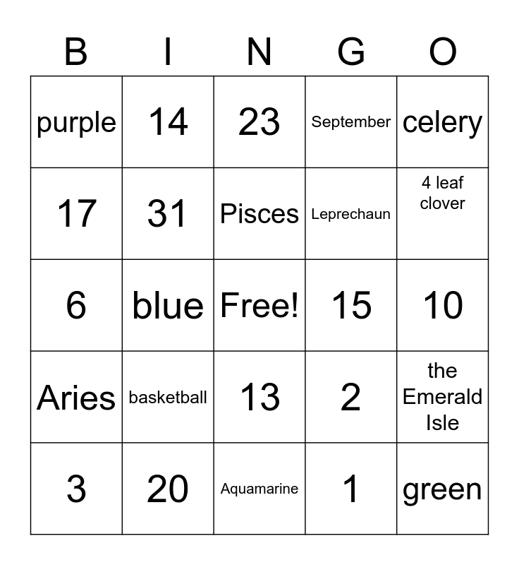 This bingo card has a free space and 24 words: basketball, 20, Pisces, 3, celery, purple, 17, 14, 15, 13, Leprechaun, 6, 2, the Emerald Isle, 31, 1, 10, 23, 4 leaf clover, blue, green, Aries, September and Aquamarine.