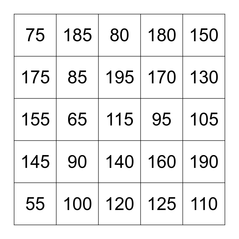 This bingo card has a free space and 29 words: 55, 60, 65, 70, 75, 80, 85, 90, 95, 100, 105, 110, 120, 125, 130, 135, 140, 145, 150, 155, 160, 165, 170, 175, 180, 185, 190, 195 and 200.