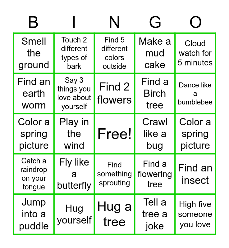 This bingo card has a free space and 24 words: Fly like a butterfly, Hug yourself, Find 2 flowers, Jump into a puddle, Cloud watch for 5 minutes, Smell the ground, Find an earth worm, Touch 2 different types of bark, Crawl like a bug, Find something sprouting, Find a Birch tree, Color a spring picture, Find a flowering tree, Find an insect, Say 3 things you love about yourself, Tell a tree a joke, Color a spring picture, Find 5 different colors outside, Dance like a bumblebee, Play in the wind, High five someone you love, Catch a raindrop on your tongue, Make a mud cake and Hug a tree.