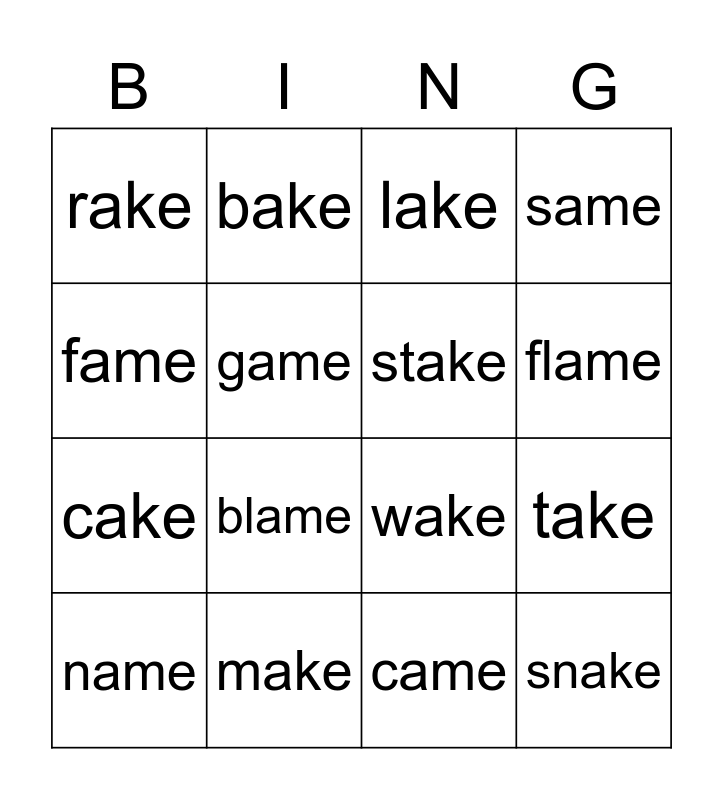 This bingo card has 16 words: make, take, lake, rake, cake, bake, wake, came, fame, game, name, same, blame, flame, stake and snake.