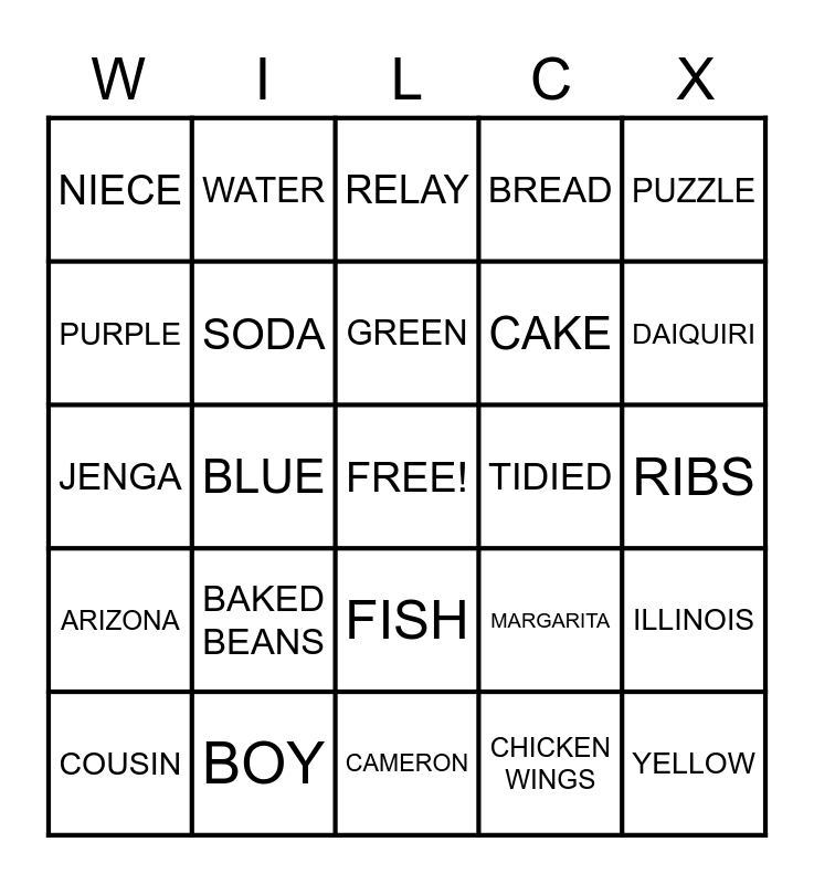 This bingo card has a free space and 75 words: GOATS, KIDS, RELAY, TEMPLE, BELTON, ROUND ROCK, SONGS, NEPHEW, MOM, DAD, TRAVEL, RED, GREEN, PURPLE, ORANGE, BLUE, BLACK, YELLOW, BOP IT, PUZZLE, CONNECT 4, JENGA, SODA, WATER, BREAD, WATERMELON, HAWAIIAN, KANSAS, RING TOSS, CORNHOLE, BEAN BAG, HULA SKIRT, PINATA, MARGARITA, DAIQUIRI, CAKE, POTATO SALAD, BURGERS, RIBS, CHICKEN WINGS, BANANAS, LAWN CHAIR, FAMILY, FRIENDS, AUNT, UNCLE, COUSIN, NIECE, SISTER, BROTHER, HOOKIE, FISH, FRIES, CANDY, L.V., MARZELLA, ORANGE, APPLE, STRAWBERRIES, CHERRIES, BAKED BEANS, VOLLEYBALL, LIMBO, KARAOKE, HULA HOOP, TIDIED, VERNELL, MINERVA, ROCKDALE, ILLINOIS, ARIZONA, BOY, ROBERT SR., CAMERON and PINEAPPLES.