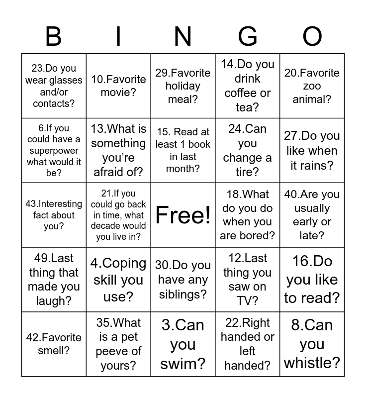 This bingo card has a free space and 50 words: 1.Where are you from?, 8.Can you whistle?, 7.Favorite Color?, 3.Can you swim?, 4.Coping skill you use?, 9.What do you wish you knew more about?, 10.Favorite movie?, 11.Favorite TV show?, 6.If you could have a superpower what would it be?, 5.Do you have a nickname?, 13.What is something you’re afraid of?, 14.Do you drink coffee or tea?, 16.Do you like to read?, 12.Last thing you saw on TV?, 17.Favorite hobby or leisure activity?, 2.When is your birthday?, 15. Read at least 1 book in last month?, 18.What do you do when you are bored?, 19.Do you ever sing in the shower?, 20.Favorite zoo animal?, 21.If you could go back in time, what decade would you live in?, 22.Right handed or left handed?, 23.Do you wear glasses and/or contacts?, 24.Can you change a tire?, 25.Food you don’t like?, 26.Favorite genre of music?, 27.Do you like when it rains?, 28.Favorite season of year?, 29.Favorite holiday meal?, 30.Do you have any siblings?, 31.Are you a dog person or a cat person?, 32.What’s the best way to start your day?, 33.Favorite candy?, 34.How do you relax after a long day?, 35.What is a pet peeve of yours?, 36.Can you ride a bike?, 37.Are you an early bird or a night owl?, 38.Do you have a hidden talent?, 39.Ever broken a bone?, 40.Are you usually early or late?, 41.What would be your spirit animal?, 44.Favorite game?, 46.If you could meet a celebrity who would it be?, 47.3 items you would bring with you on a deserted island?, 42.Favorite smell?, 43.Interesting fact about you?, 45.What type of food would you never eat?, 48.Sweet or salty snacks?, 49.Last thing that made you laugh? and 50.Do you speak another language?.