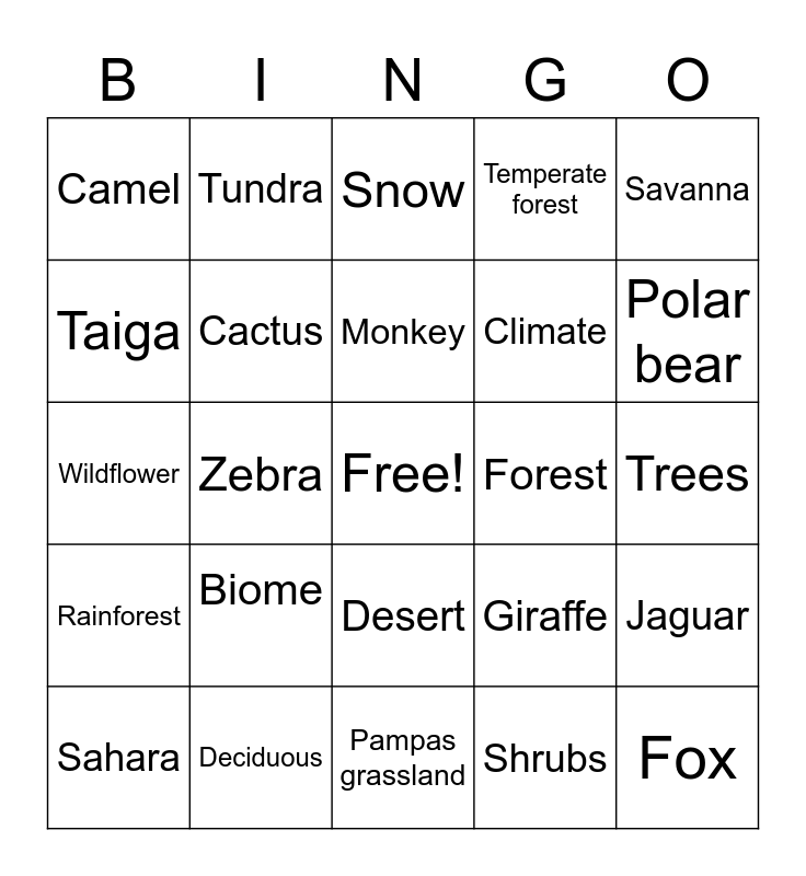 This bingo card has a free space and 24 words: Biome, Deciduous, Monkey, Sahara, Savanna, Camel, Taiga, Tundra, Forest, Desert, Climate, Wildflower, Giraffe, Jaguar, Cactus, Shrubs, Trees, Snow, Polar bear, Zebra, Fox, Rainforest, Temperate forest and Pampas grassland.