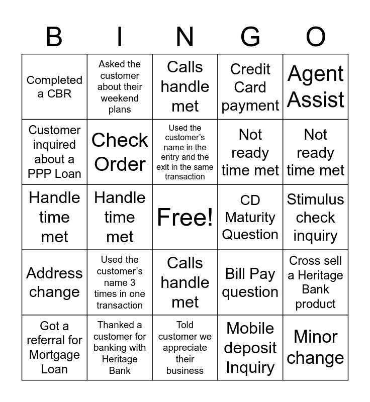 This bingo card has a free space and 24 words: Used the customer’s name 3 times in one transaction, Thanked a customer for banking with Heritage Bank, Used the customer’s name in the entry and the exit in the same transaction, Got a referral for Mortgage Loan, Agent Assist, Completed a CBR, Customer inquired about a PPP Loan, Asked the customer about their weekend plans, CD Maturity Question, Calls handle met, Not ready time met, Handle time met, Bill Pay question, Cross sell a Heritage Bank product, Check Order, Mobile deposit Inquiry, Stimulus check inquiry, Calls handle met, Not ready time met, Handle time met, Minor change, Address change, Credit Card payment and Told customer we appreciate their business.