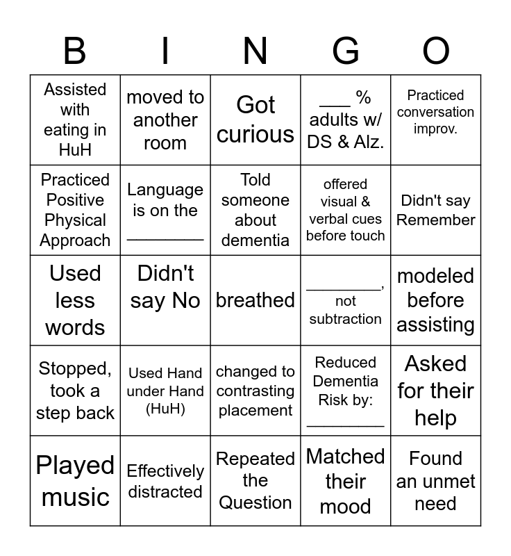 This bingo card has a free space and 29 words: Played music, Practiced Positive Physical Approach, Didn't say No, Noticed a mistake I made, Assisted with eating in HuH, Got curious, Language is on the ________, Used Hand under Hand (HuH), _________, not subtraction, Effectively distracted, modeled before assisting, Found an unmet need, Repeated the Question, Matched their mood, Didn't say Remember, Said, "Tell me more.", changed to contrasting placement, Stopped, took a step back, Practiced conversation improv., Used less words, Reduced Dementia Risk by: _________, Used Hand under Hand, offered visual & verbal cues before touch, Practiced Positive Physical Approach, ___ % adults w/ DS & Alz., moved to another room, Asked for their help, Told someone about dementia and Got 7+ hours sleep.
