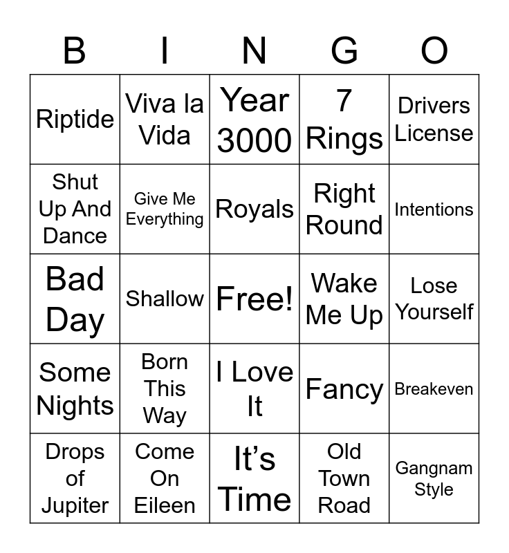 This bingo card has a free space and 105 words: Speechless, 10,000 Hours, Drivers License, Titanium, Party In The U.S.A, Levitating, Can’t Hold Us, Dance Monkey, Uptown Funk, Dynamite, Can’t Stop The Feeling, Cheap Thrills, Mr. Brightside, Better Now, Say So, I Want It That Way, Year 3000, I Wanna Dance With Somebody, Watermelon Sugar, Don’t Stop Believin’, Firework, I Gotta Feeling, Timber, Thriller, Bad Guy, Born This Way, Intentions, 7 Rings, Tik Tok, Starships, Fancy, Old Town Road, Die Young, Glad You Came, Circles, What Makes You Beautiful, All Star, Classic, Royals, Come On Eileen, Baby, Some Nights, High Hopes, Shut Up And Dance, Rude, Riptide, Uptown Girl, Gangnam Style, September, Livin’ On A Prayer, Single Ladies, Somebody That I Used to Know, Hey Ya!, Senorita, Shape of You, Party Rock Anthem, Truth Hurts, Last Friday Night, Yeah!, I Love It, Lose Yourself, Roxanne, Boom Clap, Sunday Best, 3 Nights, 100 Bad Days, Mine, Viva la Vida, Bad Day, Shallow, It’s Time, We Are Young, Nothin’ On You, Beautiful Soul, A Thousand Miles, One, Two Step, Hey, Soul Sister, Hey There Delilah, Drops of Jupiter, I’m Shipping up to Boston, Cotton Eye Joe, Sweater Weather, Don’t Start Now, Give Me Everything, Happier, Wake Me Up, Lean On, Bang!, Vacation, Without Me, Paradise, Kiss Me Thru the Phone, S.O.S, Like a G6, Breakeven, Young Dumb & Broke, Stronger, Troublemaker, Right Round, For the First Time, Airplanes, Billionaire, In My Feelings, Location and Gasolina.