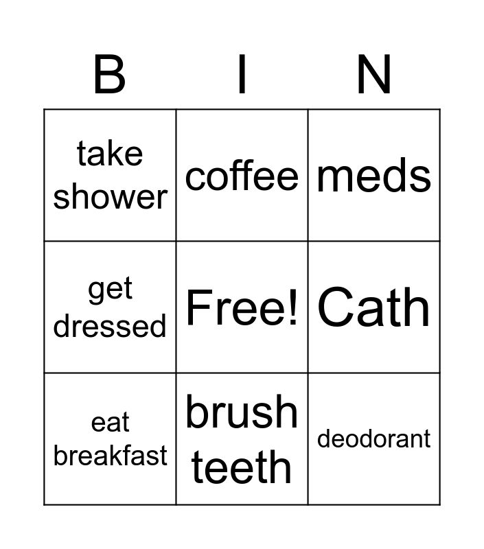 This bingo card has a free space and 8 words: Cath, meds, coffee, eat breakfast, take shower, deodorant, get dressed and brush teeth.