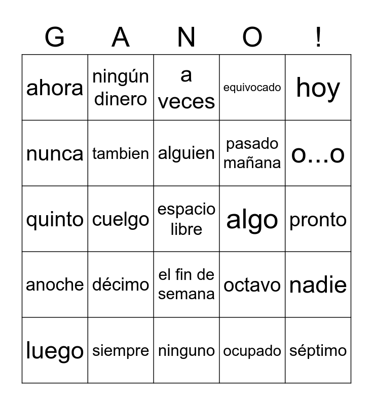 This bingo card has a free space and 29 words: sexto, siempre, a veces, tampoco, hoy, ahora, tambien, alguien, algo, nadie, luego, cuelgo, ocupado, séptimo, quinto, cuarto, ninguno, octavo, o...o, anoche, décimo, primero, pasado mañana, pronto, nunca, ningún dinero, el fin de semana, equivocado and número.