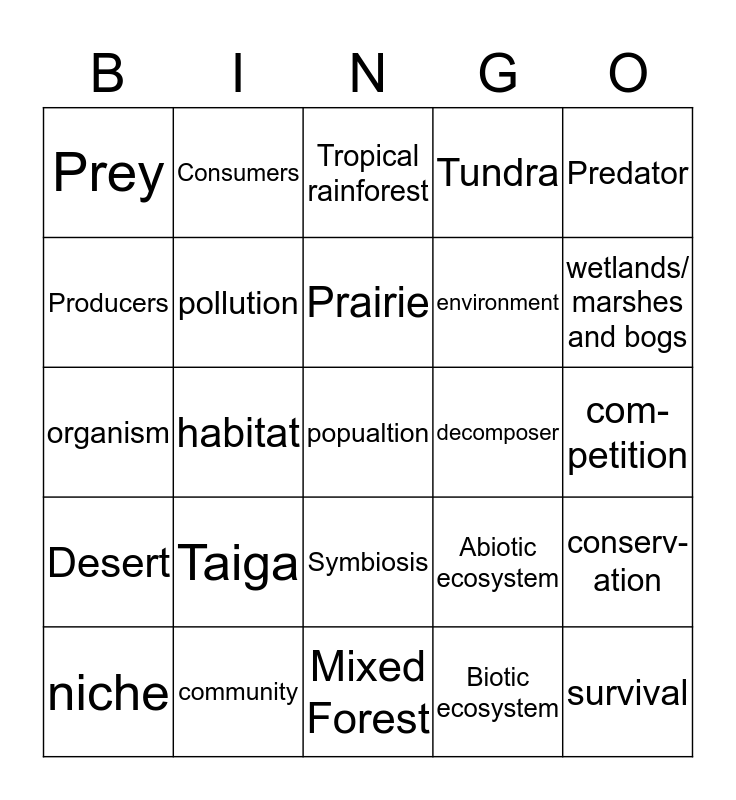 This bingo card has 25 words: Taiga, Mixed Forest, Prairie, niche, Predator, Prey, Producers, Consumers, decomposer, Symbiosis, environment, organism, Abiotic ecosystem, conserv- ation, pollution, survival, com- petition, Tropical rainforest, wetlands/ marshes and bogs, habitat, popualtion, community, Desert, Tundra and Biotic ecosystem.