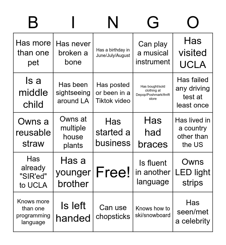 This bingo card has 26 words: Free!, Knows how to ski/snowboard, Has posted or been in a Tiktok video, Is left handed, Has visited UCLA, Has more than one pet, Is a middle child, Has never broken a bone, Has lived in a country other than the US, Is fluent in another language, Has bought/sold clothing at Depop/Poshmark/thrift store, Owns a reusable straw, Owns LED light strips, Knows more than one programming language, Owns at multiple house plants, Knows how to knit/crochet/embroider, Can play a musical instrument, Has already "SIR'ed" to UCLA, Has a birthday in June/July/August, Has started a business, Has failed any driving test at least once, Can use chopsticks, Has had braces, Has a younger brother, Has been sightseeing around LA and Has seen/met a celebrity.