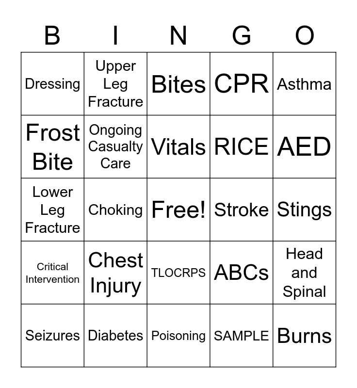 This bingo card has a free space and 36 words: Scene Survey, Primary Survey, Secondary Survey, Ongoing Casualty Care, ABCs, Critical Intervention, Vitals, Shock, Asthma, Anaphylactic Shock, Choking, CPR, Heart Attack, Stroke, AED, Dressing, Bandages, Chest Injury, Burns, Bites, Stings, Head and Spinal, Diabetes, Seizures, Poisoning, Upper Leg Fracture, Lower Leg Fracture, Sprained Ankle, RICE, Frost Bite, Sunburn, EPI Pen, SAMPLE, TLOCRPS, Head to Toe and Head-tilt, Chin-lift.