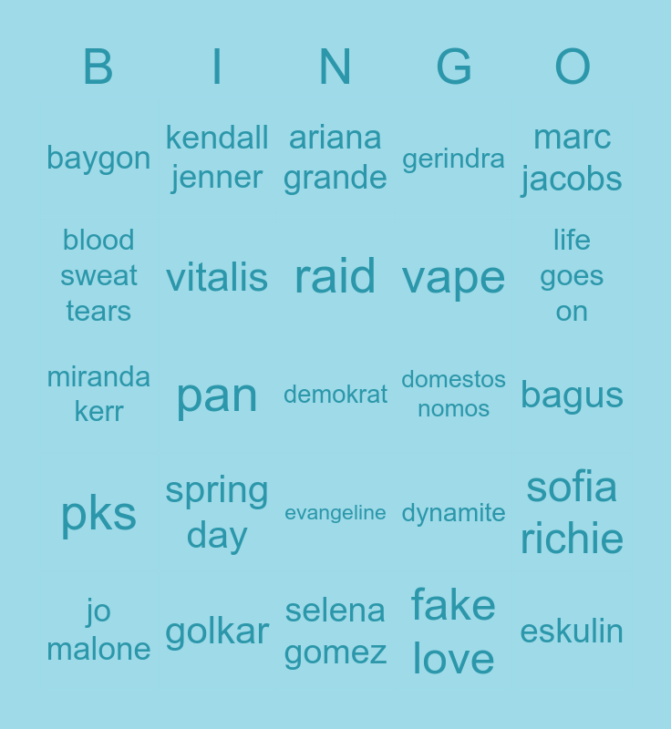 This bingo card has 25 words: spring day, selena gomez, raid, jo malone, marc jacobs, baygon, blood sweat tears, kendall jenner, domestos nomos, evangeline, vape, miranda kerr, dynamite, sofia richie, vitalis, eskulin, bagus, ariana grande, life goes on, pan, demokrat, golkar, pks, gerindra and fake love.