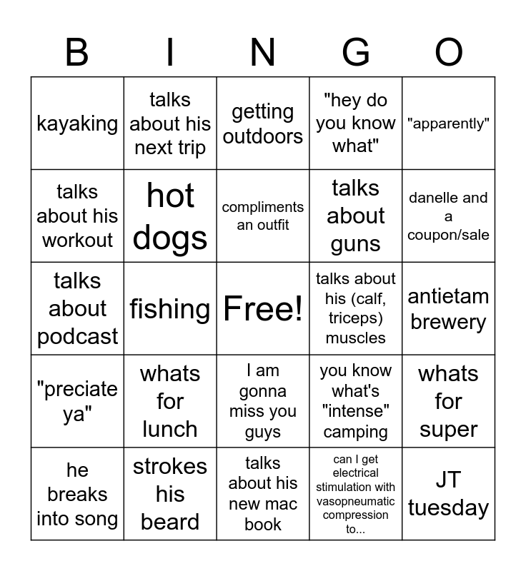 This bingo card has a free space and 31 words: talks about his new mac book, smoked (cheese, meats), fishing, archery/ cross bow, kayaking, getting outdoors, hot dogs, you know what's "intense" camping, talks about his (calf, triceps) muscles, can I get electrical stimulation with vasopneumatic compression to..., antietam brewery, JT tuesday, badlands, jeeps, danelle and a coupon/sale, horse kick me in the tricep joke, whats for super, whats for lunch, "preciate ya", I am gonna miss you guys, "apparently", "half to death", he breaks into song, talks about his next trip, talks about guns, talks about his workout, "hey do you know what", talks about podcast, strokes his beard, compliments an outfit and shows off on an exs to a pt.
