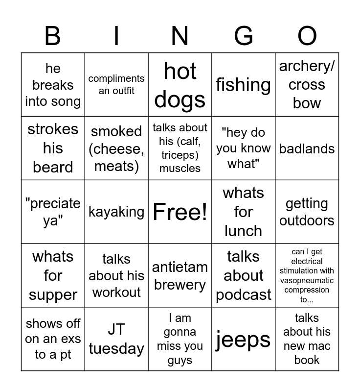 This bingo card has a free space and 24 words: talks about his workout, JT tuesday, talks about his (calf, triceps) muscles, shows off on an exs to a pt, archery/ cross bow, he breaks into song, strokes his beard, compliments an outfit, whats for lunch, antietam brewery, "hey do you know what", "preciate ya", talks about podcast, can I get electrical stimulation with vasopneumatic compression to..., smoked (cheese, meats), jeeps, getting outdoors, hot dogs, badlands, kayaking, talks about his new mac book, whats for supper, fishing and I am gonna miss you guys.