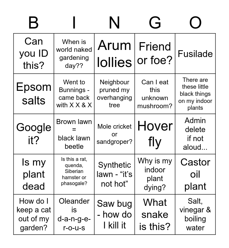 This bingo card has a free space and 24 words: Is this a rat, quenda, Siberian hamster or phasogale?, Oleander is d-a-n-g-e-r-o-u-s, Neighbour pruned my overhanging tree, How do I keep a cat out of my garden?, Fusilade, Can you ID this?, Epsom salts, When is world naked gardening day??, Hover fly, Synthetic lawn - “it’s not hot”, Can I eat this unknown mushroom?, Google it?, Why is my indoor plant dying?, Castor oil plant, Went to Bunnings - came back with X X & X, What snake is this?, Admin delete if not aloud..., Arum lollies, There are these little black things on my indoor plants, Brown lawn = black lawn beetle, Salt, vinegar & boiling water, Is my plant dead, Friend or foe? and Saw bug - how do I kill it.