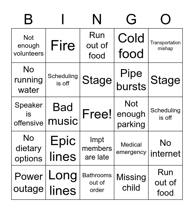 This bingo card has a free space and 68 words: Weather, Run out of food, Traffic, Theme fell flat, Speaker drops out, Cold food, Fire, Power outage, Stage, Speaker is offensive, Impt members are late, AV company makes changes, Scheduling is off, Transportation mishap, The speaker goes over time, No running water, Bad music, Not enough volunteers, Not enough parking, Epic lines, Pipe bursts, Medical emergency, No dietary options, Bathrooms out of order, Not enough bathrooms, Political incident, Missing child, No ATM machine, No internet, Weather, Run out of food, Traffic, Theme fell flat, Speaker drops out, Cold food, No seating, Fire, Power outage, Stage, Speaker is offensive, Impt members are late, AV company makes changes, Scheduling is off, Transportation mishap, The speaker goes over time, No running water, Bad music, Not enough volunteers, Not enough parking, Long lines, Pipe bursts, Medical emergency, No dietary options, Bathrooms out of order, Not enough bathrooms, Political incident, Missing child, No ATM machine, No internet, No permits, Expensive food, Too crowded, No recycling, Crowd control, Started late, Alcohol issues, Merchandise and No shade.