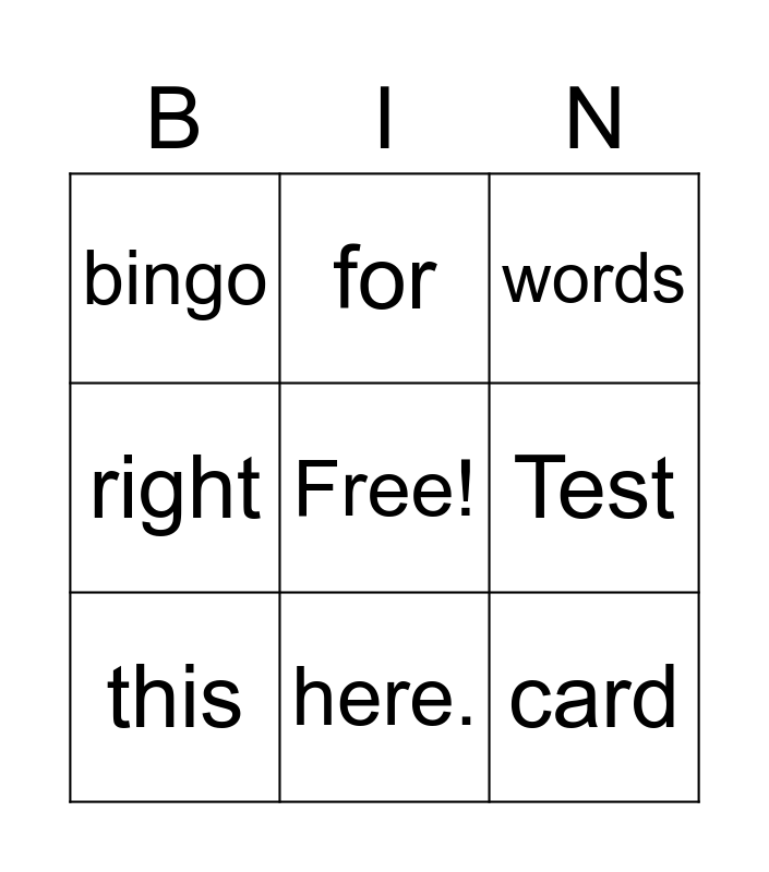 This bingo card has a free space and 8 words: Test, words, for, this, bingo, card, right and here..