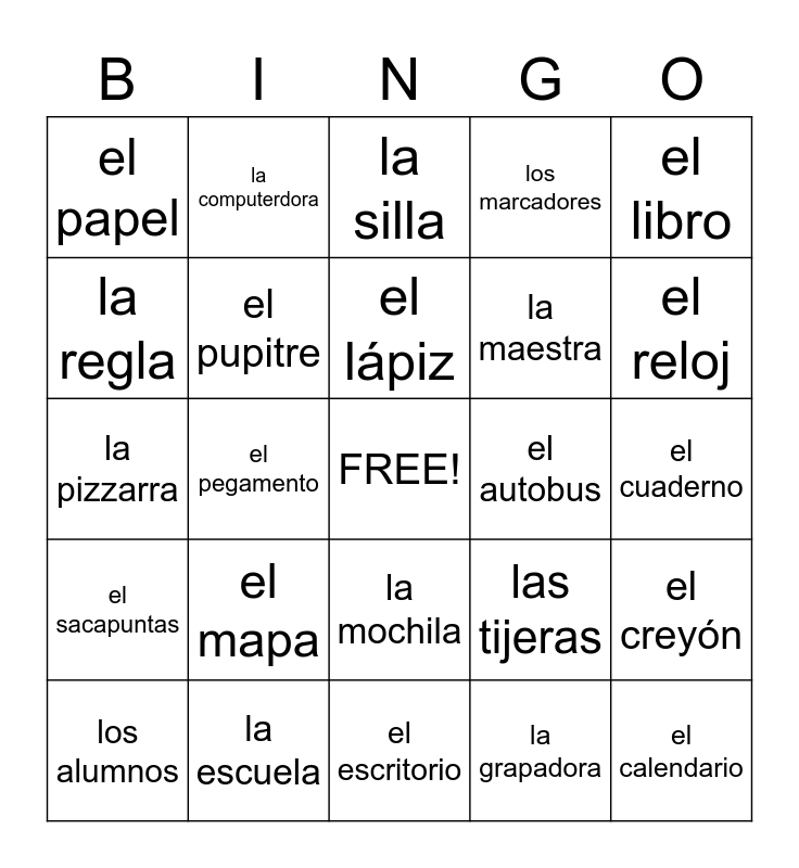 This bingo card has a free space and 24 words: el mapa, la escuela, el lápiz, los alumnos, el libro, el papel, la regla, la computerdora, el autobus, la mochila, la maestra, la pizzarra, las tijeras, el creyón, el pupitre, la grapadora, el cuaderno, la silla, el reloj, el pegamento, el calendario, el sacapuntas, los marcadores and el escritorio.
