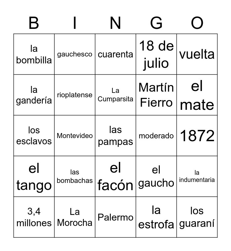 This bingo card has 30 words: La Morocha, 1879, Montevideo, 'huacho', la bombilla, cuarenta, rioplatense, el facón, moderado, Palermo, 1872, las pampas, la estrofa, los guaraní, el mate, llamadas, el gaucho, el tango, las bombachas, vuelta, los esclavos, Río de la Plata, gauchesco, Martín Fierro, la gandería, 18 de julio, la indumentaria, 3,4 millones, La Cumparsita and el dulce de leche.