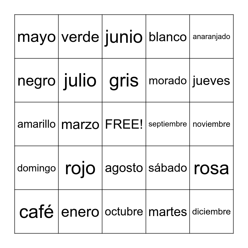 This bingo card has a free space and 30 words: enero, febrero, marzo, abril, mayo, junio, julio, agosto, septiembre, octubre, noviembre, diciembre, martes, miércoles, jueves, viernes, sábado, domingo, rojo, anaranjado, amarillo, azul, verde, morado, negro, blanco, rosa, café, gris and lunes.