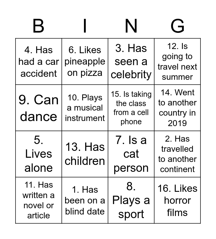 This bingo card has 16 words: 1. Has been on a blind date, 2. Has travelled to another continent, 3. Has seen a celebrity, 4. Has had a car accident, 5. Lives alone, 6. Likes pineapple on pizza, 7. Is a cat person, 8. Plays a sport, 9. Can dance, 10. Plays a musical instrument, 11. Has written a novel or article, 12. Is going to travel next summer, 13. Has children, 14. Went to another country in 2019, 15. Is taking the class from a cell phone and 16. Likes horror films.