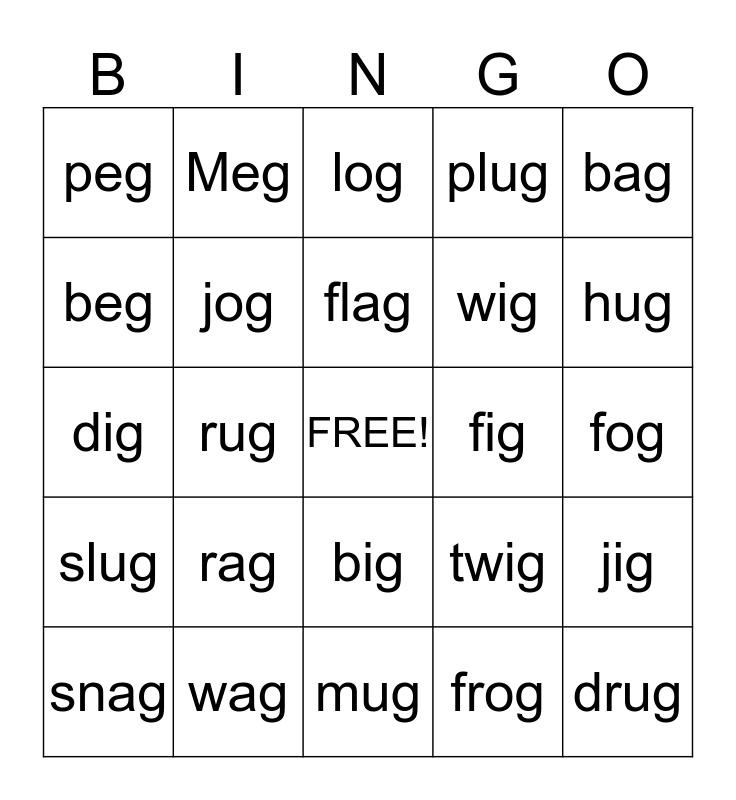 This bingo card has a free space and 24 words: rag, wag, flag, snag, bag, peg, beg, Meg, fig, big, wig, dig, twig, jig, jog, frog, fog, log, hug, rug, drug, slug, plug and mug.