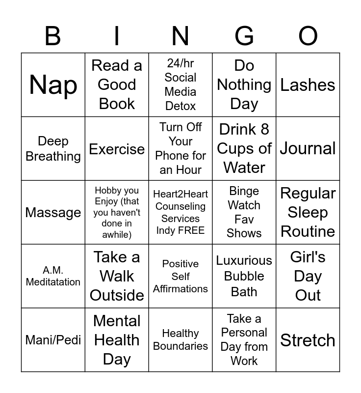 This bingo card has a free space and 24 words: Take a Walk Outside, Mental Health Day, Turn Off Your Phone for an Hour, Mani/Pedi, Lashes, Nap, Deep Breathing, Read a Good Book, Binge Watch Fav Shows, Positive Self Affirmations, Drink 8 Cups of Water, Massage, Luxurious Bubble Bath, Girl's Day Out, Exercise, Take a Personal Day from Work, Regular Sleep Routine, 24/hr Social Media Detox, Journal, Hobby you Enjoy (that you haven't done in awhile), Stretch, A.M. Meditatation, Do Nothing Day and Healthy Boundaries.