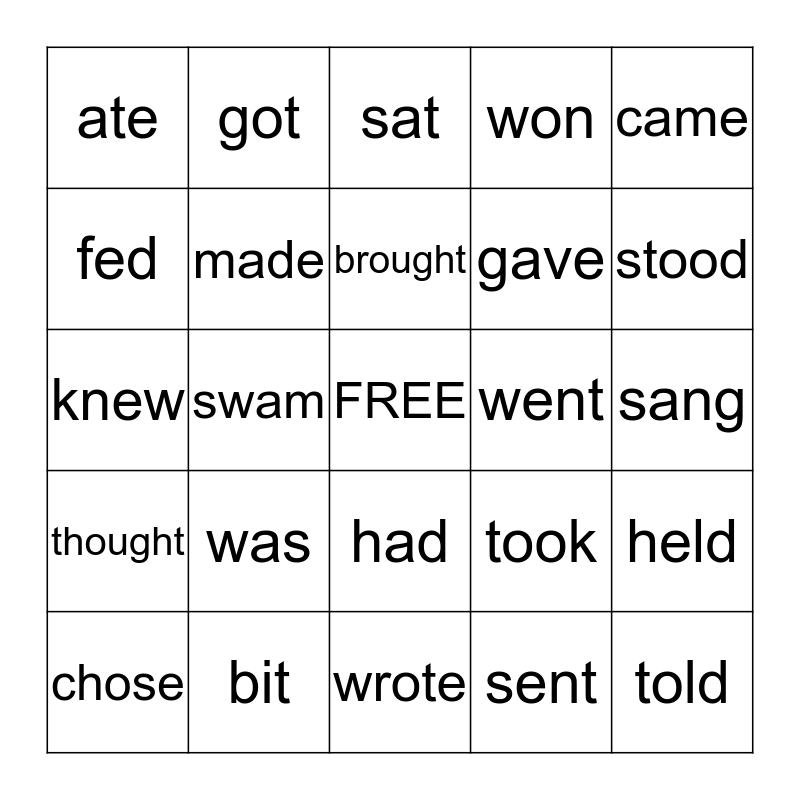 This bingo card has a free space and 24 words: was, bit, brought, chose, came, ate, fed, got, went, had, gave, knew, took, held, made, sent, sang, sat, stood, swam, told, thought, won and wrote.