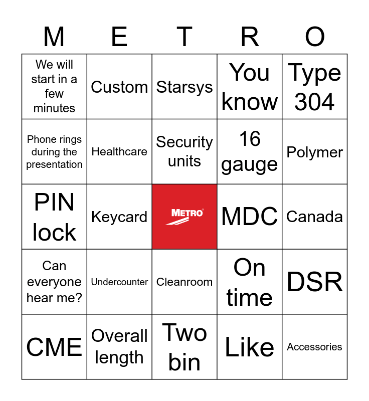 This bingo card has a free space and 106 words: Stainless Steel Tables, Gowning Benches, Type 304, Calendar, Metromax, SES, Qwikslot, Qwiksight, Microban, Antimicrobial, Chome, Metroseal, Quickbase, Hubspot, Cannabis, SPD, Starsys, Wrong meeting, Wire, Catalog, Cleanroom, Website, Pricelist, Tall, Short, Undercounter, Polymer, You know, Please mute, 5 minute break, On time, Like, Umm, Opportunity, Please mute your mic., COVID, Crash carts, Perhaps, Security units, MetroTtrux, Connection issue, My WiFi is bad, Pause for questions, Can everyone hear me?, Can you see my screen?, Phone rings during the presentation, We will wait a few minutes for everyone to join, We will start in a few minutes, 5 Inch diameter, Accessories, Weight capacity, Overall length, Benchmark, Seismic, Totes and bins, Lean, Rack, SIP, MSS, Custom, Standard, Full extension, Top track, Basket, Rust-proof, Coorrosion, Contacts, Session went long, 16 gauge, PIN lock, Keycard, Two bin, XD, Extra capacity, Adjustable, Configurator, Just so everyone knows, Plastic, Region, PPE, Utility cart, Equipment planner, Bookings, MetroHub, Wilkes Barre, Acuna, MDC, Worldwide, John Nackley, Deals, 90-day forecast, Backlog, Buying group, National accounts, Grainger, DSR, Hospital, Labs, Excel, Canada, Healthcare, CP, VWR, Fisher, CME and SASE.