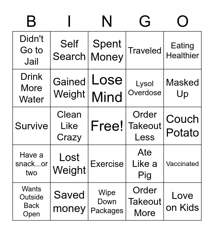 This bingo card has a free space and 24 words: Lost Weight, Saved money, Lose Mind, Wants Outside Back Open, Eating Healthier, Didn't Go to Jail, Drink More Water, Self Search, Order Takeout Less, Exercise, Lysol Overdose, Survive, Ate Like a Pig, Vaccinated, Gained Weight, Order Takeout More, Couch Potato, Spent Money, Masked Up, Clean Like Crazy, Love on Kids, Have a snack...or two, Traveled and Wipe Down Packages.