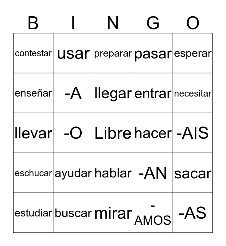 This bingo card has a free space and 24 words: ayudar, buscar, llegar, estudiar, esperar, contestar, enseñar, usar, hacer, hablar, entrar, llevar, -AN, sacar, -A, -AMOS, -AIS, preparar, necesitar, -O, -AS, eschucar, pasar and mirar.