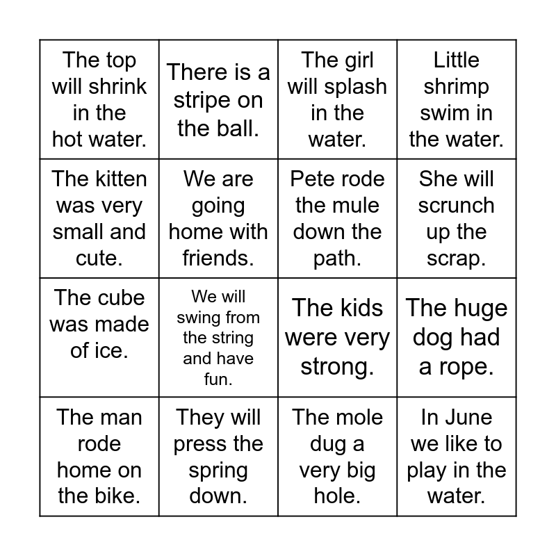 This bingo card has 20 words: The huge dog had a rope., You can stretch your legs and run fast., The girl will splash in the water., The girl and boy will split the cake., The man rode home on the bike., The kitten was very small and cute., They will press the spring down., The top will shrink in the hot water., The cube was made of ice., There is a stripe on the ball., We will swing from the string and have fun., The kids were very strong., We are going home with friends., In June we like to play in the water., Pete rode the mule down the path., The wet path was from the hose., She will scrunch up the scrap., Little shrimp swim in the water., The mole dug a very big hole. and He wrote the note alone..