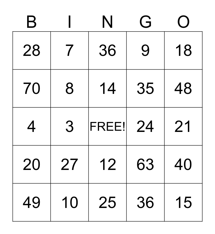 This bingo card has a free space and 41 words: 2, 4, 6, 8, 10, 12, 14, 16, 18, 20, 3, 9, 15, 21, 24, 27, 30, 28, 32, 36, 40, 5, 25, 35, 45, 50, 36, 42, 48, 54, 60, 7, 49, 56, 63, 70, 64, 72, 80, 81 and 90.