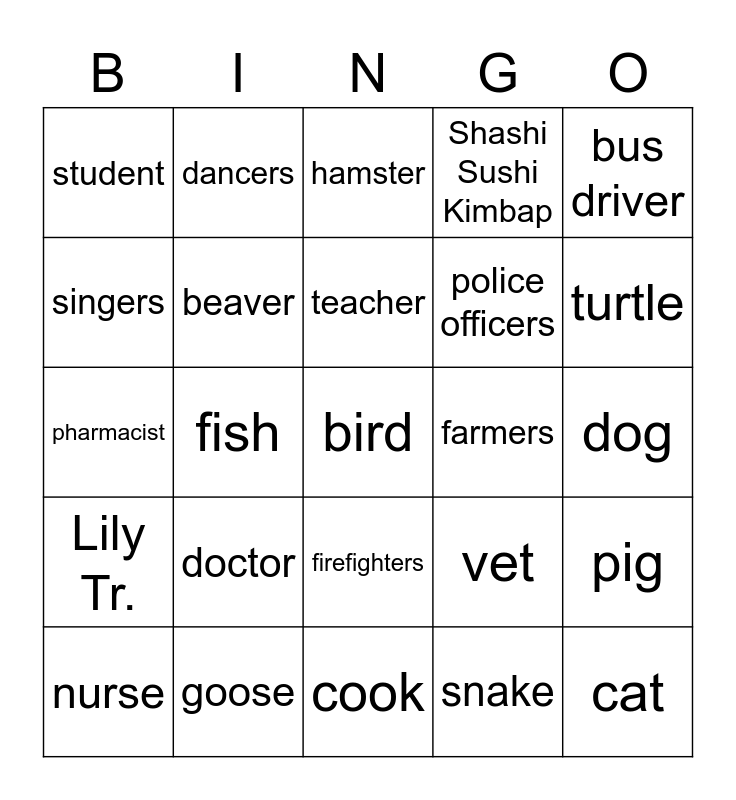 This bingo card has 25 words: doctor, cook, teacher, nurse, bus driver, student, singers, dancers, farmers, firefighters, police officers, pharmacist, vet, pig, beaver, cat, dog, hamster, turtle, fish, bird, goose, Lily Tr., Shashi Sushi Kimbap and snake.
