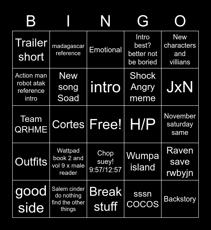 This bingo card has a free space and 34 words: RWBY switch any diraction on the tree, sssn COCOS, Ur mom gay, Summer rose, Outfits, New song Soad, New characters and villians, good side, madagascar reference, AiW Too, intro, Emotional, Reunion, Angry meme, H/P, JxN, Salem cinder do nothing find the other things, Team QRHME, Wattpad book 2 and vol 9 x male reader, Wumpa island, Chop suey! 9:57/12:57, Sneek peek, Trailer short, November saturday same, Break stuff, Backstory, Intro best? better not be boried, Cast away, Shock Angry meme, Action man robot atak reference intro, Beat, Cortes, Raven save rwbyjn and Ship.