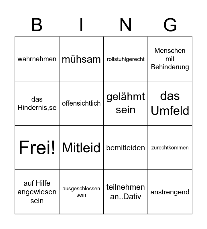 This bingo card has 20 words: zurechtkommen, bevormunden, rollstuhlgerecht, der Rollstuhl, auf Hilfe angewiesen sein, das Hindernis,se, ausgeschlossen sein, wahrnehmen, Frei!, mühsam, Mitleid, bemitleiden, offensichtlich, anstrengend, gelähmt sein, die Umgebung, das Umfeld, Menschen mit Behinderung, teilnehmen an..Dativ and teilhaben an ...Dativ.