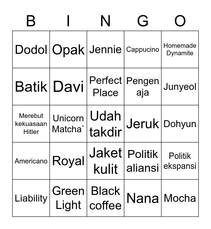 This bingo card has a free space and 24 words: Royal, Green Light, Perfect Place, Liability, Homemade Dynamite, Dodol, Batik, Opak, Jeruk, Jaket kulit, Pengen aja, Merebut kekuasaan Hitler, Politik aliansi, Politik ekspansi, Davi, Nana, Dohyun, Jennie, Junyeol, Unicorn Matcha`, Mocha, Americano, Cappucino and Black coffee.