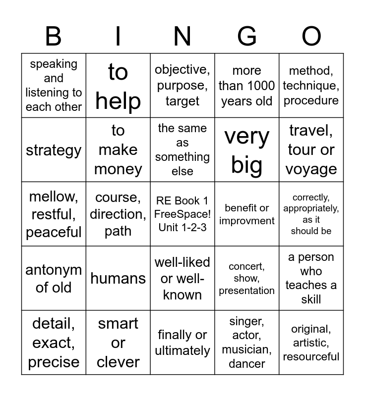 This bingo card has a free space and 24 words: humans, smart or clever, the same as something else, detail, exact, precise, method, technique, procedure, speaking and listening to each other, strategy, to help, benefit or improvment, well-liked or well-known, very big, mellow, restful, peaceful, concert, show, presentation, a person who teaches a skill, to make money, singer, actor, musician, dancer, correctly, appropriately, as it should be, objective, purpose, target, travel, tour or voyage, course, direction, path, original, artistic, resourceful, antonym of old, more than 1000 years old and finally or ultimately.