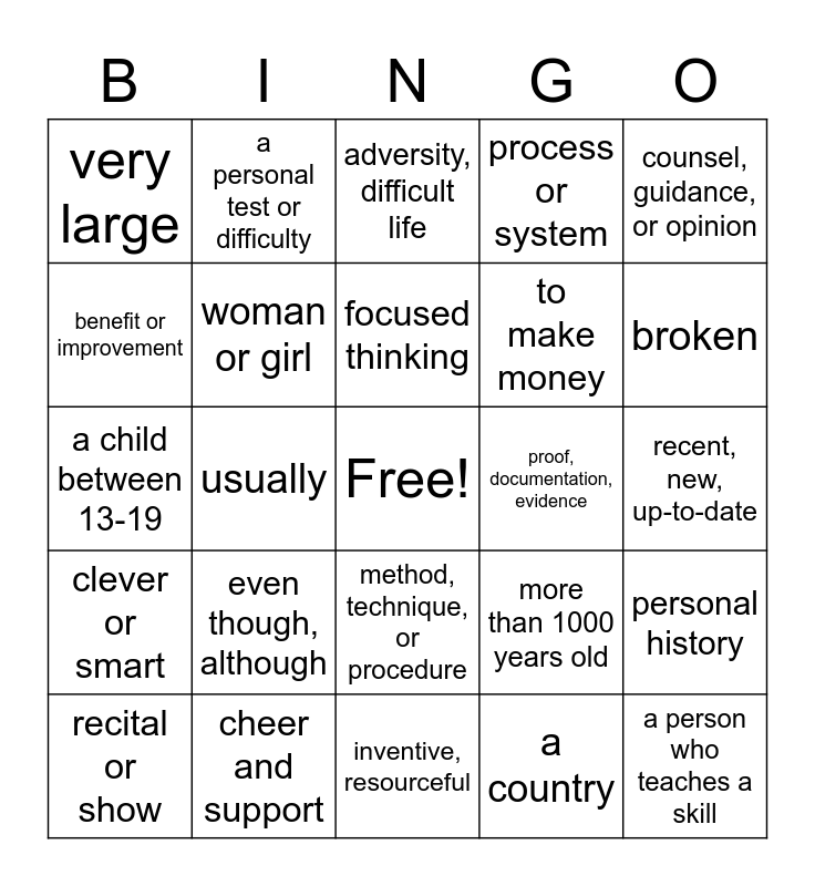This bingo card has a free space and 54 words: to exchange words with someone, clever or smart, the same in some way, exact or precise, method, technique, or procedure, plan, process or system, to help, benefit or improvement, well-known or well-liked, very large, soothing, mellow, restful, cheer and support, recital or show, correctly, inventive, resourceful, a person who teaches a skill, to make money, dancers, singers, painters, recent, new, up-to-date, more than 1000 years old, finally, ultimately, proof, documentation, evidence, counsel, guidance, or opinion, comfortable, peaceful, a personal test or difficulty, 100 years, to run away from, excessive, a country, to know it already, spiritual, indigenous inhabitant, courageous, and heroic, adversity, difficult life, traditions and customs, a child between 13-19, personal history, concern or problem, woman or girl, way of behaving, places to socialize with others, listeners or watchers, fit in, even though, although, relationship, specific, precise, pay no attention to, focused thinking, usually, broken, to make better, ability or talent and think clearly.